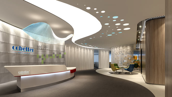 過濾公司辦公室前廳設計:設計會說話,相信在此處得到很好的展現,頂面設計與地面設計相互依托,說不清到底是誰在依附于誰,但終極目的不會改變,那就是指引。