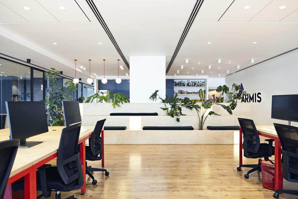 設計理念-專業,干凈,簡單和舒適-靈感來自公司的關鍵屬性。家具、室內裝潢和照明都是定制的,特別強調顏色和材料.在開闊的空間里,白色的墻壁與地板,輕木定制家具,綠色和黃色沙發和紅色的火花,體現照明元素和凳子。