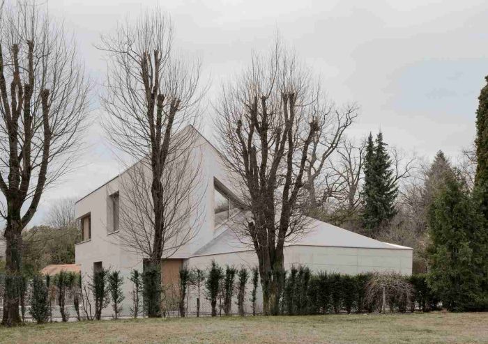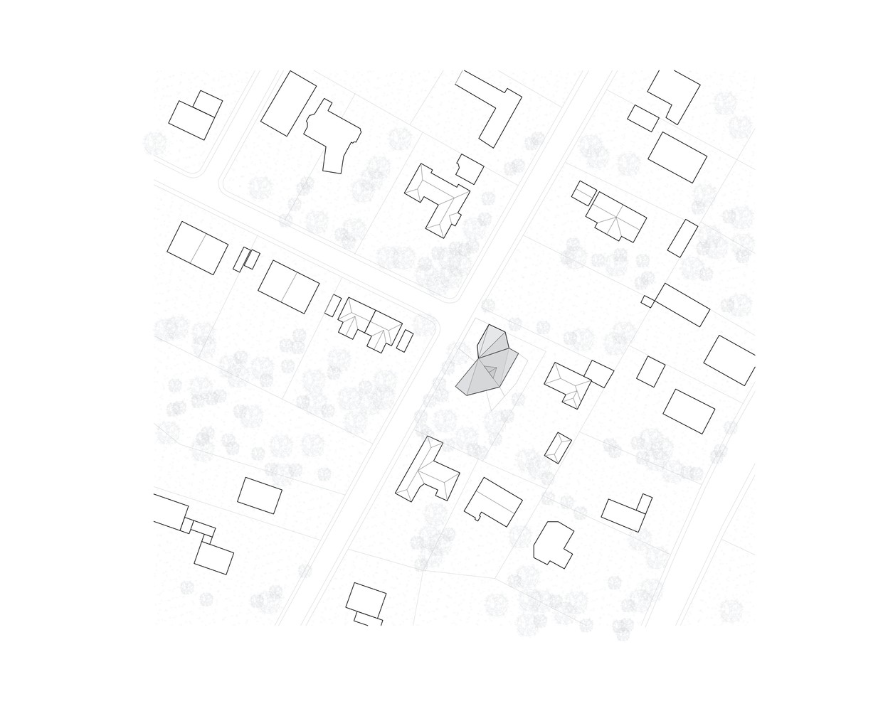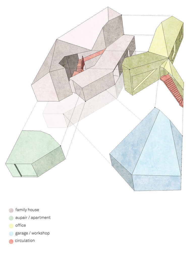 水晶體的形狀從周圍的建筑物中得到的靈感,20世紀30年代的四坡屋頂矗立在大花園的一角的緊湊單體房屋。在這里,六邊形體塊是傾斜的,為在西北的車庫留出空間,并為南面留出一個寬敞的花園。平面圍繞一個菱形樓梯井展開,樓梯井是承重核心筒,并融入了中央服務軸線之中。房間圍繞這個中心元素布置,并且每個房間都通向不同的外部空間。