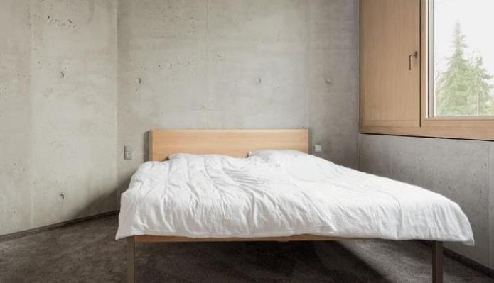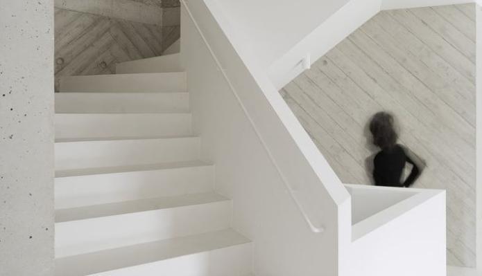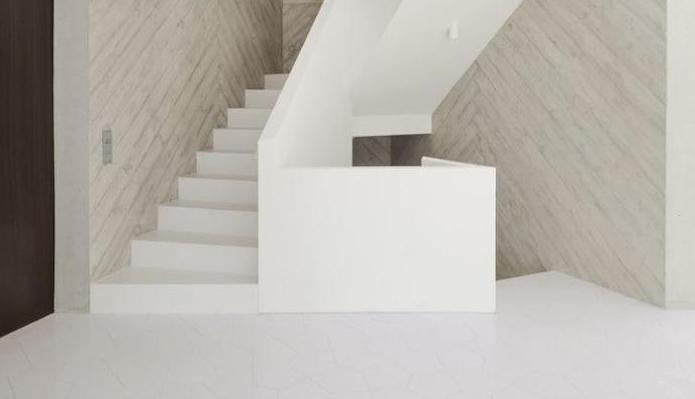 形式的統一體現在材料的統一上。厚厚的超輕質混凝土自絕緣墻表面光滑并帶有紋理,而屋頂的底面則用粗糙的木板制成,強調了各個表面的方向。入口區域的地面上鋪了對角圖案的奶白色多邊形瓷磚。這些柔和的表面調和了奶白色石膏、灰色石頭和地毯的中性色調,以及橡木和煙熏橡木飾物的自然色調。