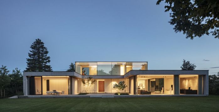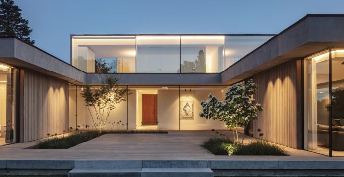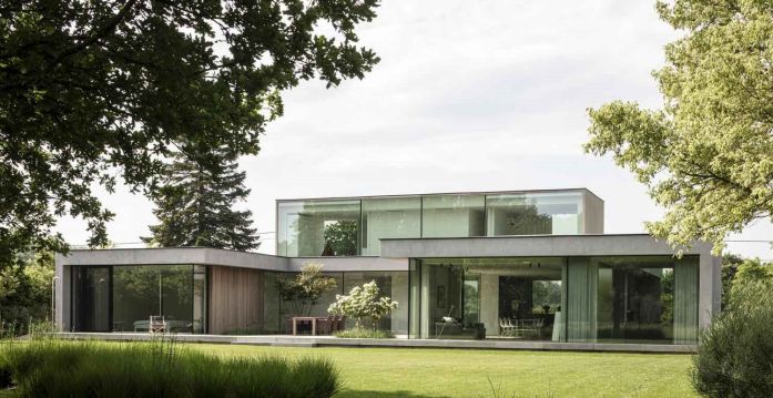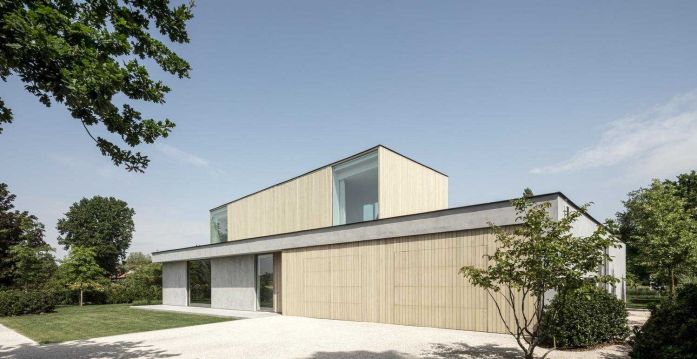 底層的支撐底座是由一種混凝土外觀的平灰泥突出的。在上面的較小體積是在木箱和包層上實現的。然而,這兩卷在物化上的差異似乎不難對比。畢竟,灰泥是以淺灰色進行的,它的底土和一種特殊的清掃技術也使灰泥具有溫暖的色調。這樣做,某些等級出現,使整體看起來不那么平坦,更自然。這與大窗戶結合在一起,產生了美麗的和諧。
