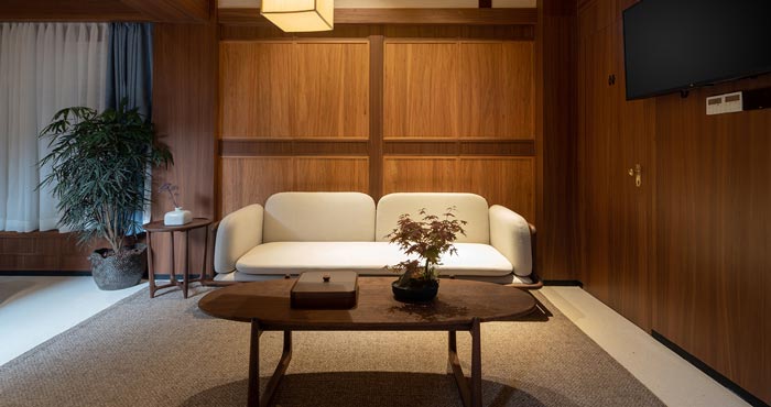 本次為民宅民宿設(shè)計(jì)項(xiàng)目,在設(shè)計(jì)中保留原建筑的柱網(wǎng)空間,同時(shí)以院落為中心,將空間劃分為四個(gè)客房區(qū)域,整體呈現(xiàn)中軸對(duì)稱的格局。