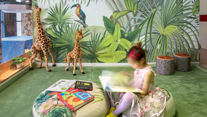 教育培訓閱讀區設計:在這里孩子光著腳盤坐在柔軟的地上,認真的閱讀著自己喜歡的書籍,這樣可以讓孩子褪掉束縛,全身心的投入到閱讀當中,相信每一個人小時候,席地盤坐相信是每一個人都有過的經歷。