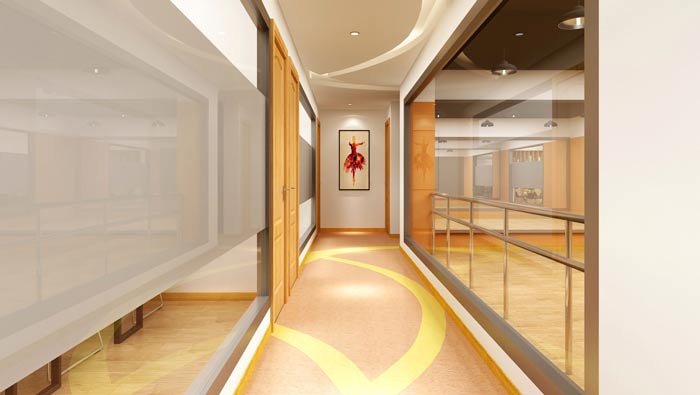 舞蹈培訓機構二樓過道設計:二樓主要以舞蹈培訓為主,過道地面地板膠和頂面造型設計相互呼應,這樣的設計既能保證空間的靈動,同時又能折射出一種孩童對未來的幻想。
