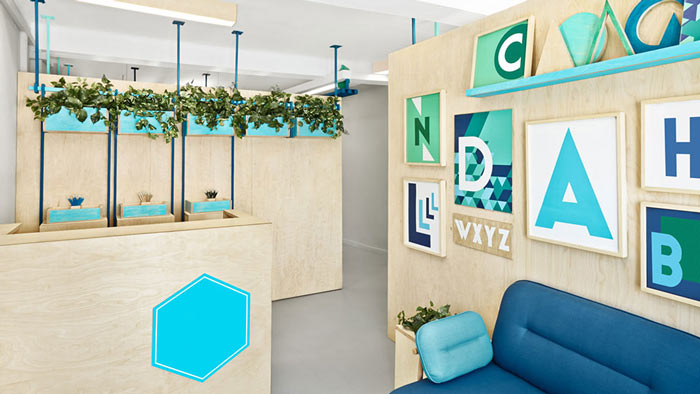 英語教育培訓機構接待區設計:A、B、C、D、E、F、G等26個字母,設計師以相框的方式,將其固定在接待區背后墻上,目的就是希望在潛移默化中讓大家喜歡它,這樣學習起來將會事半功倍。